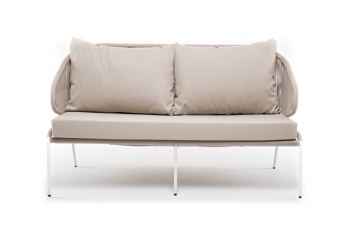 "Милан" диван 2-местный плетеный из роупа, каркас алюминий белый муар, роуп бежевый круглый, ткань бежевая 035