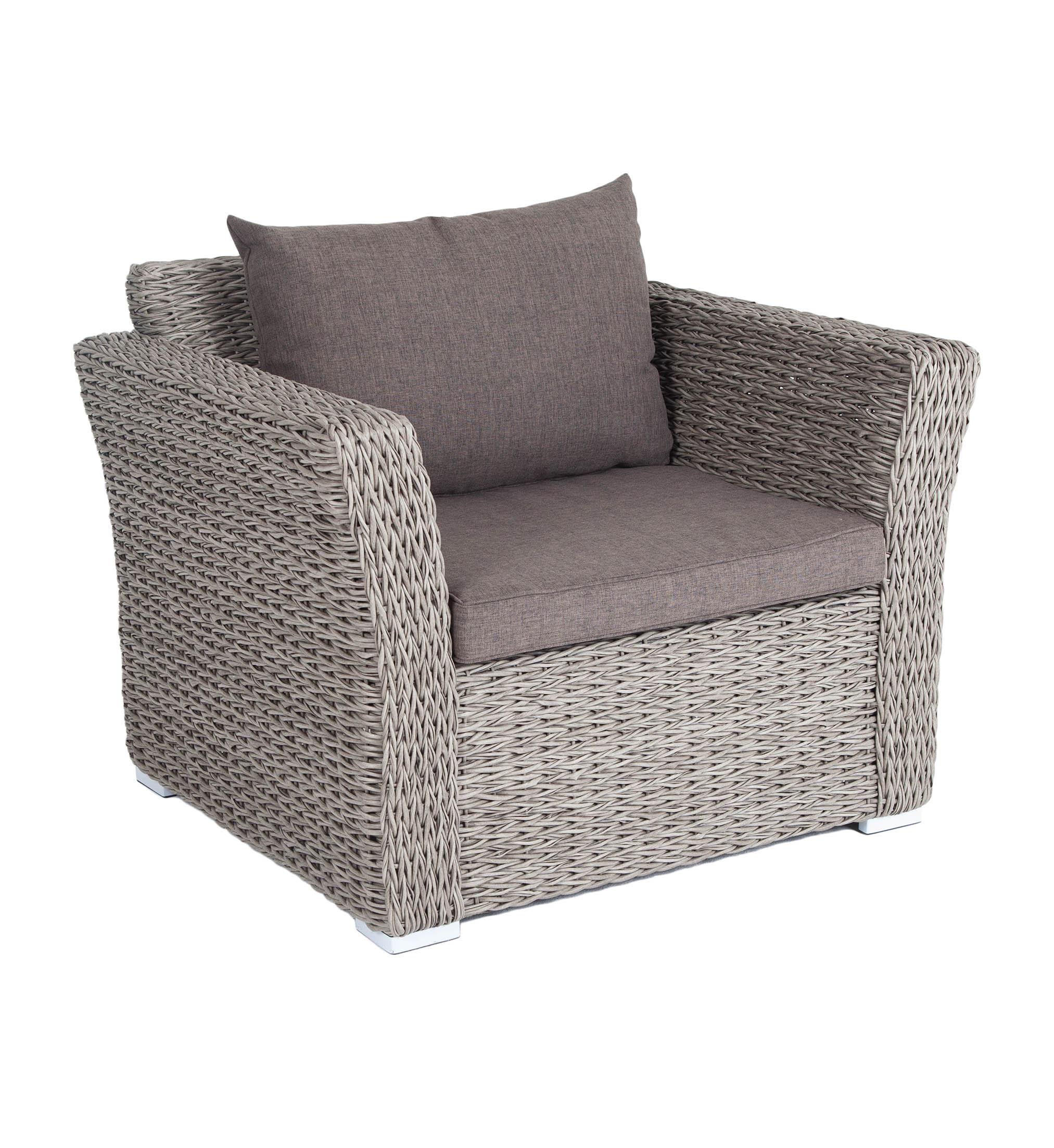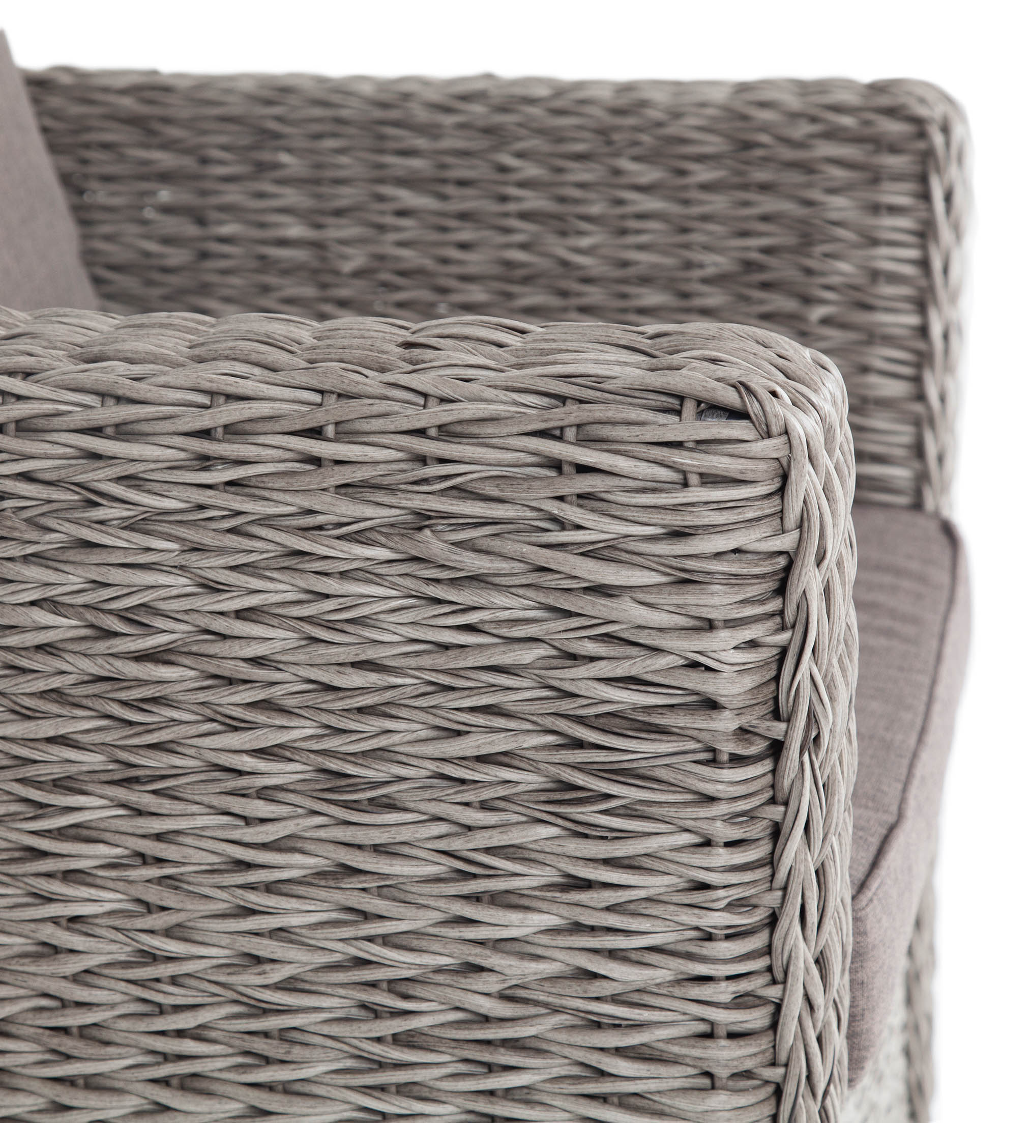 Кресло из искусственного ротанга «Капучино» серого цвета, прекрасно подходит для обустройства веранды, а относительно небольшой вес, который составляет 21,5 кг, увеличивает мобильность данной модели. Плетение используется вида «гиацинт».