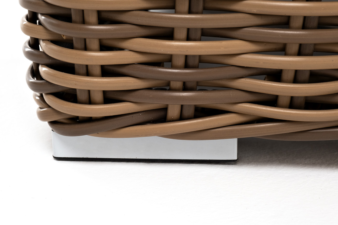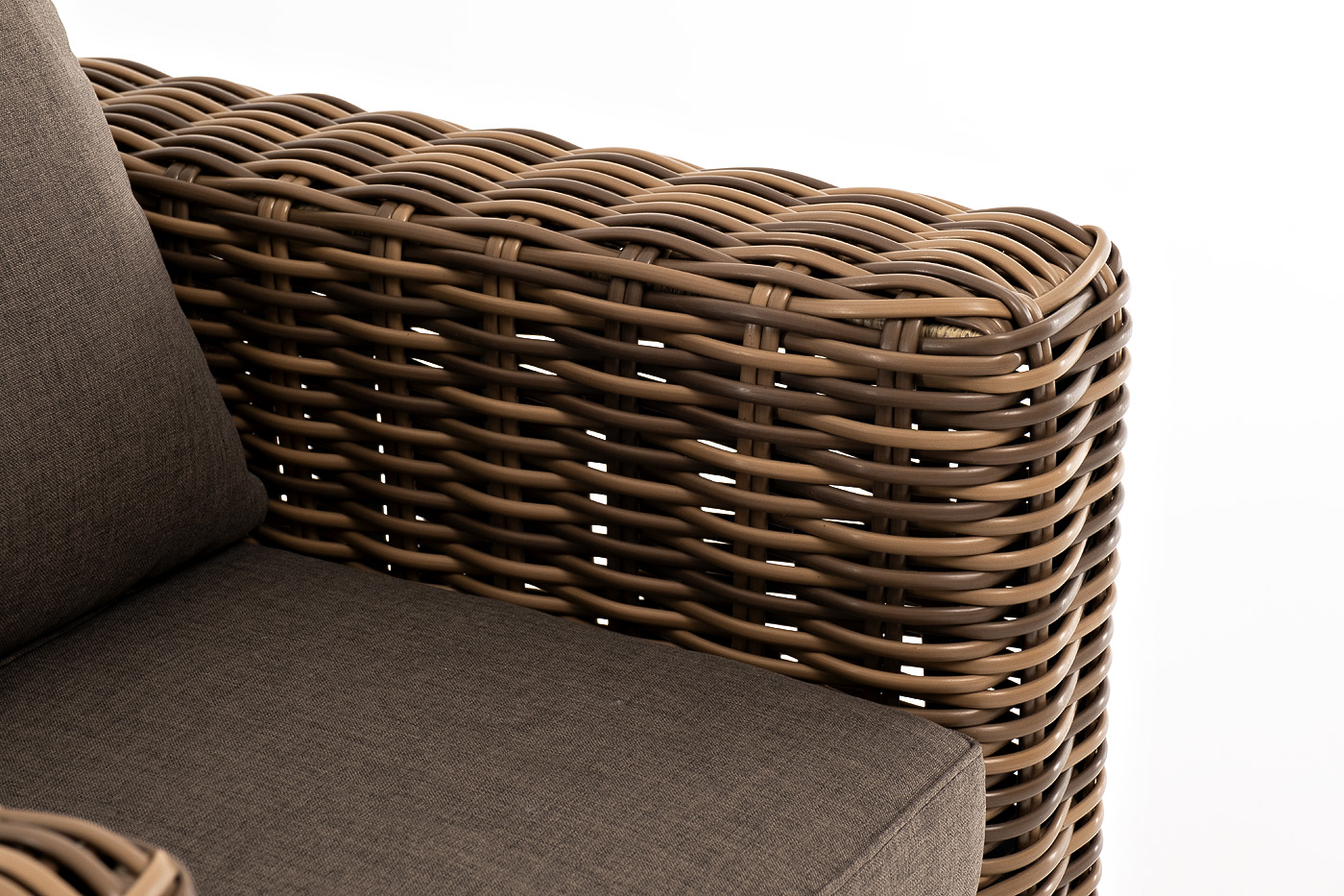 Кресло оснащено каркасом из прочного алюминия, ручное круглое плетение является основным декоративным элементом мебели. Оно выполнено из искусственного ротанга в соломенном цвете.
