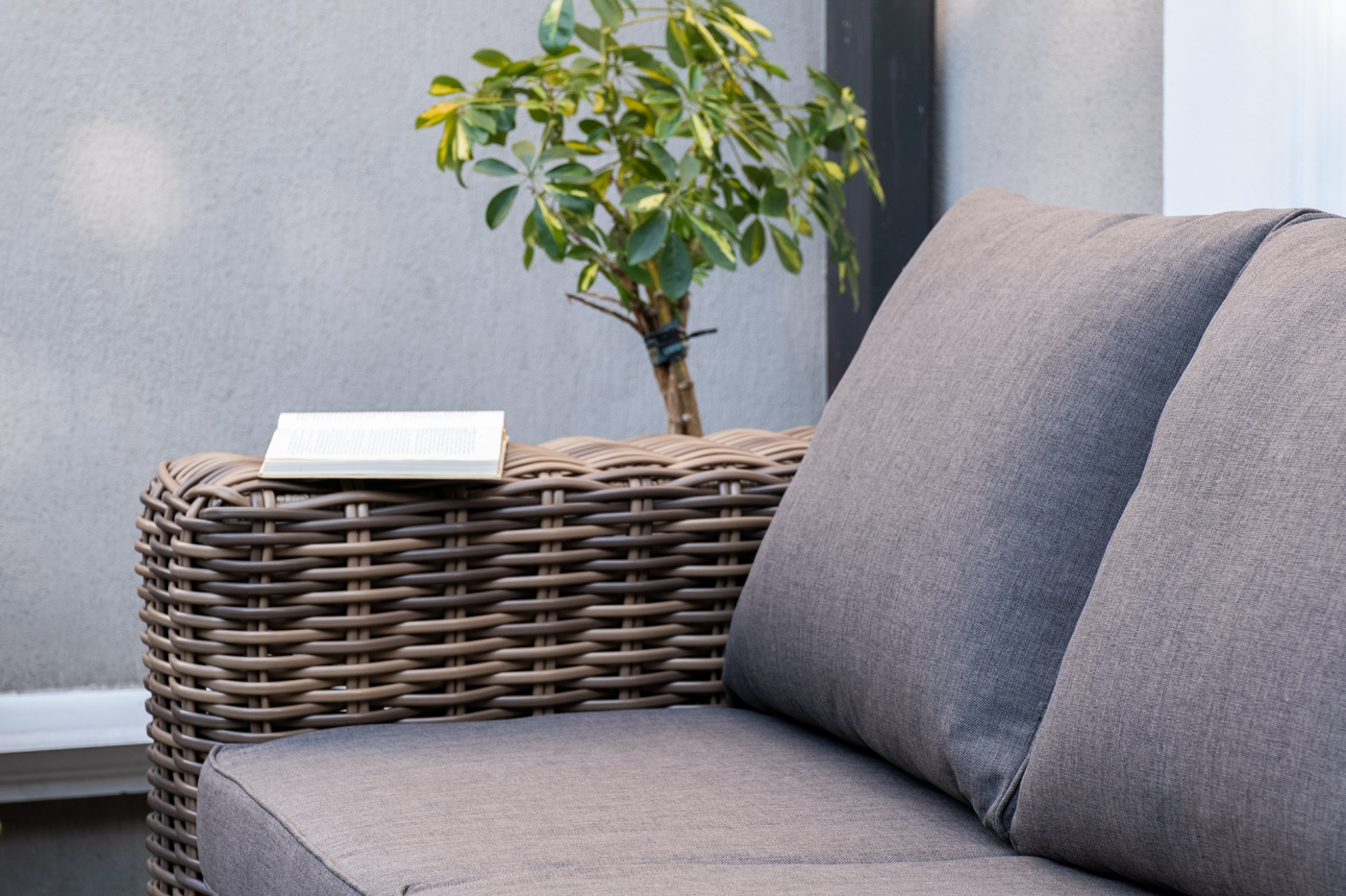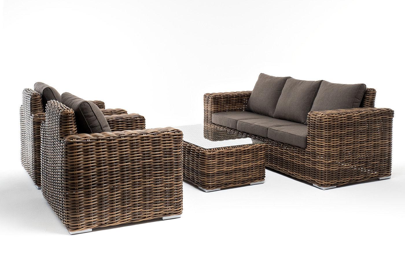 Плетеная мебель дополнена удобными подушками в серо-коричневых чехлах. При их изготовлении используют полиэстер, плотность – 230гр/м2. Он обрабатывается влагоотталкивающей пропиткой для повышения защитных свойств материала.